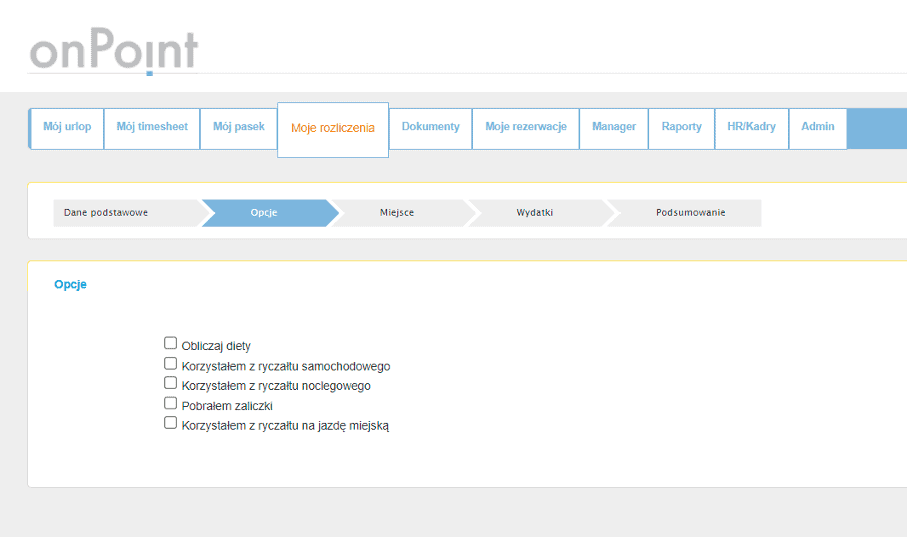 Samoobsługowa platforma pracownicza onPoint oferuje możliwość rozliczania delegacji i wydatków, a także zawiera kalkulator podróży służbowej. Rolą pracownika jest tylko wprowadzenie danych. System sam pobiera odpowiednie kursy, diety, ryczałty i dodatki. Pracownik wprowadza informacje dotyczące środka transportu i celu wyjazdu, kolejno wybiera z dostępnych opcji (np. obliczanie diety czy zaznaczenie pobrania zaliczki).